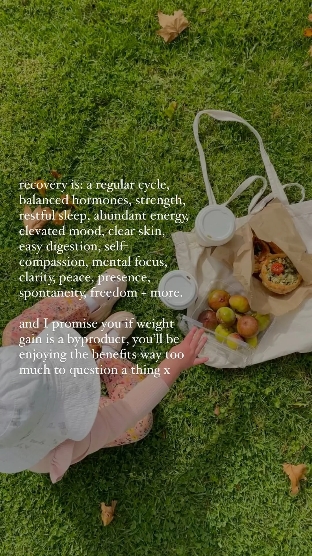 HA recovery meant gaining weight, my fertility, health & LIFE. When your world revolves around micromanaging your body, it’s really hard to feel present, to have deep connections, to relax, to let go, and to feel at peace. The consistent guilt, analysation, overthinking + anxiety that more often than not comes hand in hand with disordered eating & body obsession steals so much of that.